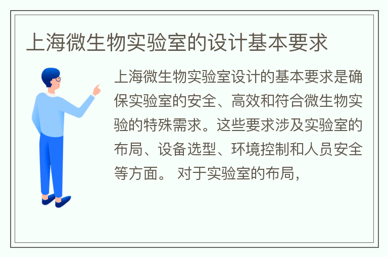上海微生物实验室设计的基本要求是确保实验室的安全、高效和符合微生物实验的特殊需求。这些要求涉及实验室的布局、设备选型、环境控制和人员安全等方面。 对于实验室的布局,......【点击详情】