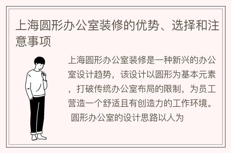 上海圆形办公室装修是一种新兴的办公室设计趋势,该设计以圆形为基本元素,打破传统办公室布局的限制,为员工营造一个舒适且有创造力的工作环境。 圆形办公室的设计思路以人为......【点击详情】