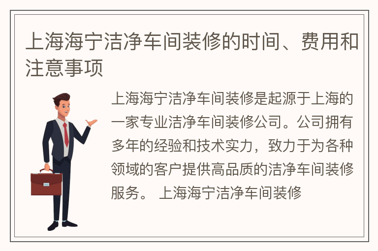 上海海宁洁净车间装修是起源于上海的一家专业洁净车间装修公司。公司拥有多年的经验和技术实力,致力于为各种领域的客户提供高品质的洁净车间装修服务。 上海海宁洁净车间装修......【点击详情】