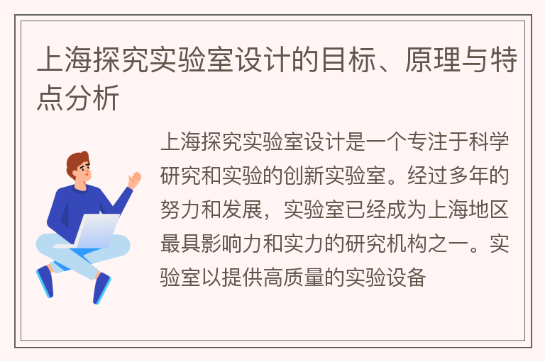 上海探究实验室设计是一个专注于科学研究和实验的创新实验室。经过多年的努力和发展,实验室已经成为上海地区最具影响力和实力的研究机构之一。实验室以提供高质量的实验设备......【点击详情】