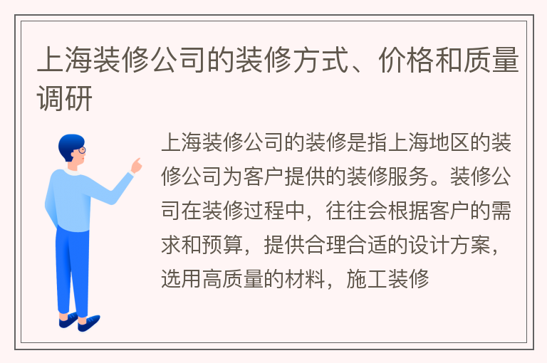 上海装修公司的装修是指上海地区的装修公司为客户提供的装修服务。装修公司在装修过程中,往往会根据客户的需求和预算,提供合理合适的设计方案,选用高质量的材料,施工装修......【点击详情】