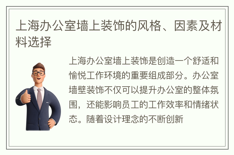 上海办公室墙上装饰是创造一个舒适和愉悦工作环境的重要组成部分。办公室墙壁装饰不仅可以提升办公室的整体氛围,还能影响员工的工作效率和情绪状态。随着设计理念的不断创新......【点击详情】