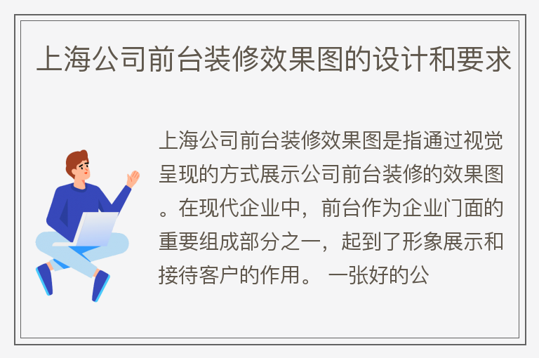 上海公司前台装修效果图是指通过视觉呈现的方式展示公司前台装修的效果图。在现代企业中,前台作为企业门面的重要组成部分之一,起到了形象展示和接待客户的作用。 一张好的公......【点击详情】