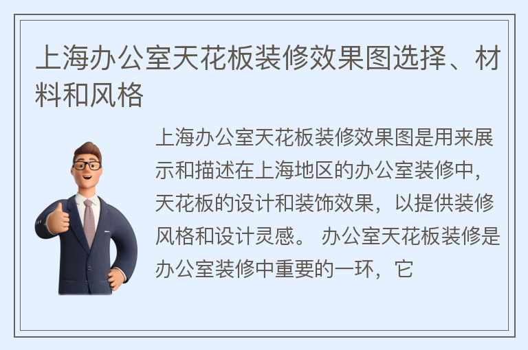 上海办公室天花板装修效果图是用来展示和描述在上海地区的办公室装修中,天花板的设计和装饰效果,以提供装修风格和设计灵感。 办公室天花板装修是办公室装修中重要的一环,它......【点击详情】