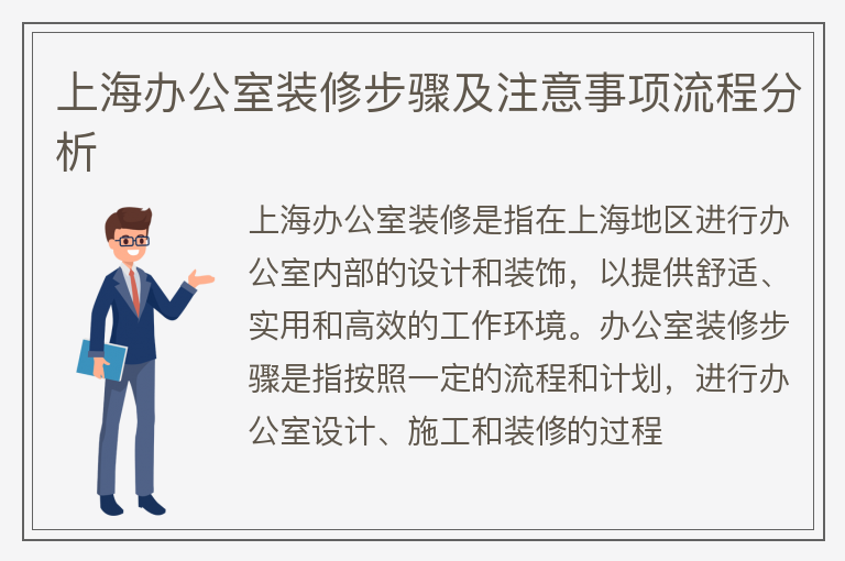 上海办公室装修是指在上海地区进行办公室内部的设计和装饰,以提供舒适、实用和高效的工作环境。办公室装修步骤是指按照一定的流程和计划,进行办公室设计、施工和装修的过程......【点击详情】