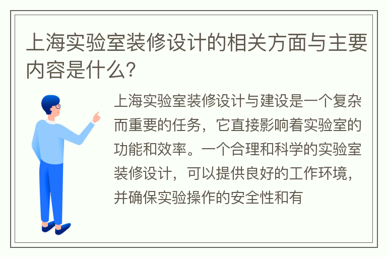 上海实验室装修设计与建设是一个复杂而重要的任务,它直接影响着实验室的功能和效率。一个合理和科学的实验室装修设计,可以提供良好的工作环境,并确保实验操作的安全性和有......【点击详情】