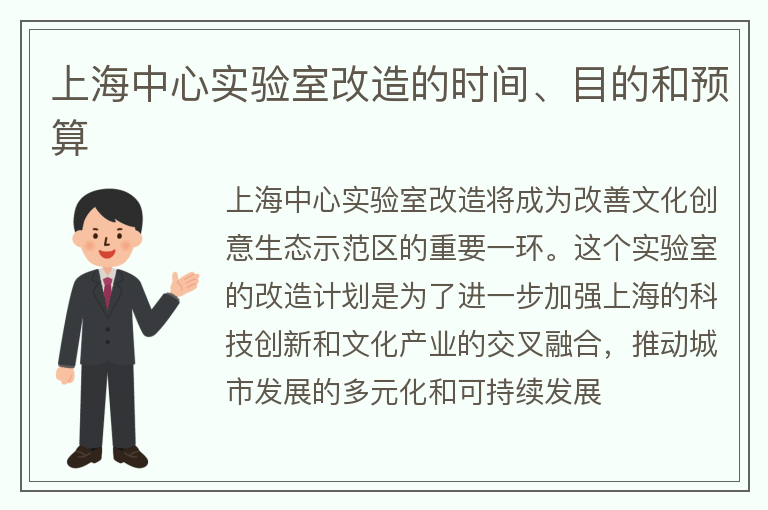 上海中心实验室改造将成为改善文化创意生态示范区的重要一环。这个实验室的改造计划是为了进一步加强上海的科技创新和文化产业的交叉融合,推动城市发展的多元化和可持续发展......【点击详情】