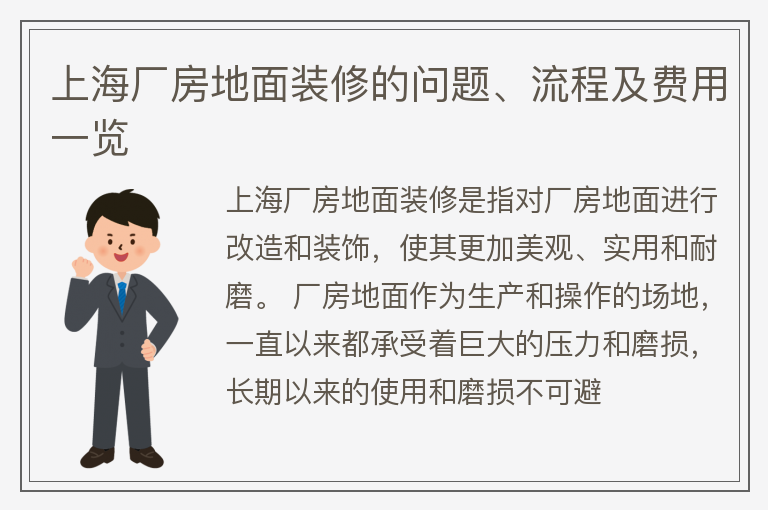 上海厂房地面装修是指对厂房地面进行改造和装饰,使其更加美观、实用和耐磨。 厂房地面作为生产和操作的场地,一直以来都承受着巨大的压力和磨损,长期以来的使用和磨损不可避......【点击详情】