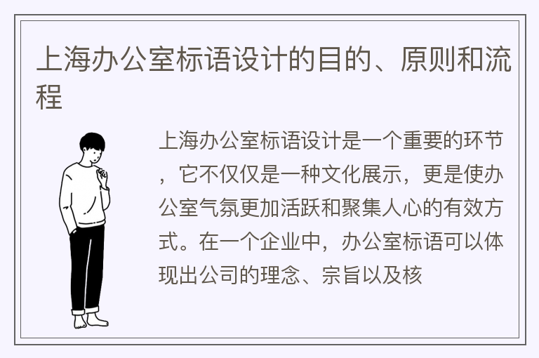 上海办公室标语设计是一个重要的环节,它不仅仅是一种文化展示,更是使办公室气氛更加活跃和聚集人心的有效方式。在一个企业中,办公室标语可以体现出公司的理念、宗旨以及核......【点击详情】