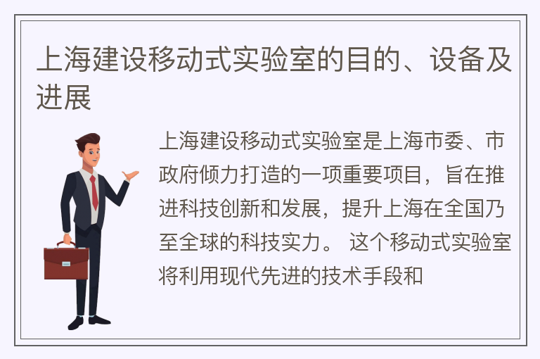 上海建设移动式实验室是上海市委、市政府倾力打造的一项重要项目,旨在推进科技创新和发展,提升上海在全国乃至全球的科技实力。 这个移动式实验室将利用现代先进的技术手段和......【点击详情】
