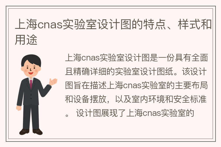 上海cnas实验室设计图是一份具有全面且精确详细的实验室设计图纸。该设计图旨在描述上海cnas实验室的主要布局和设备摆放,以及室内环境和安全标准。 设计图展现了上海cnas实验室的......【点击详情】