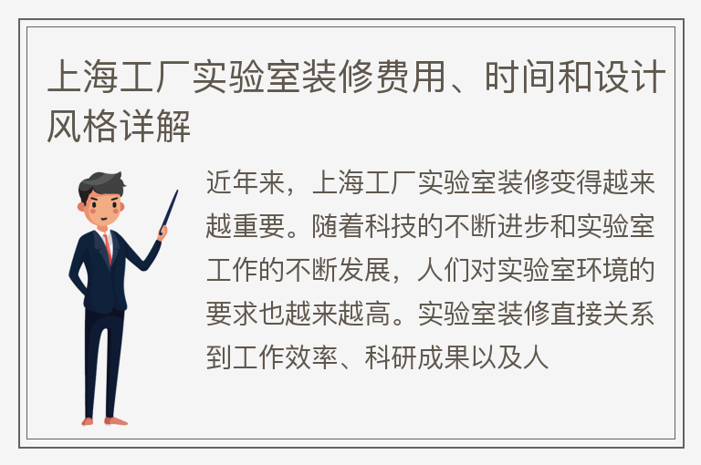 近年来,上海工厂实验室装修变得越来越重要。随着科技的不断进步和实验室工作的不断发展,人们对实验室环境的要求也越来越高。实验室装修直接关系到工作效率、科研成果以及人......【点击详情】