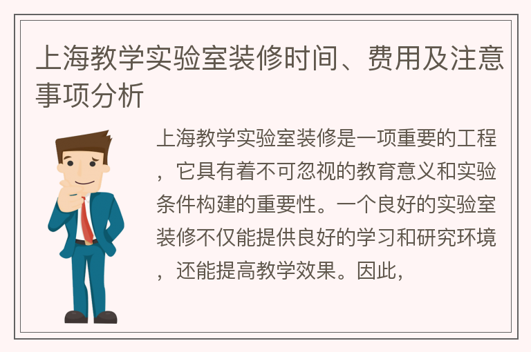 上海教学实验室装修是一项重要的工程,它具有着不可忽视的教育意义和实验条件构建的重要性。一个良好的实验室装修不仅能提供良好的学习和研究环境,还能提高教学效果。因此,......【点击详情】