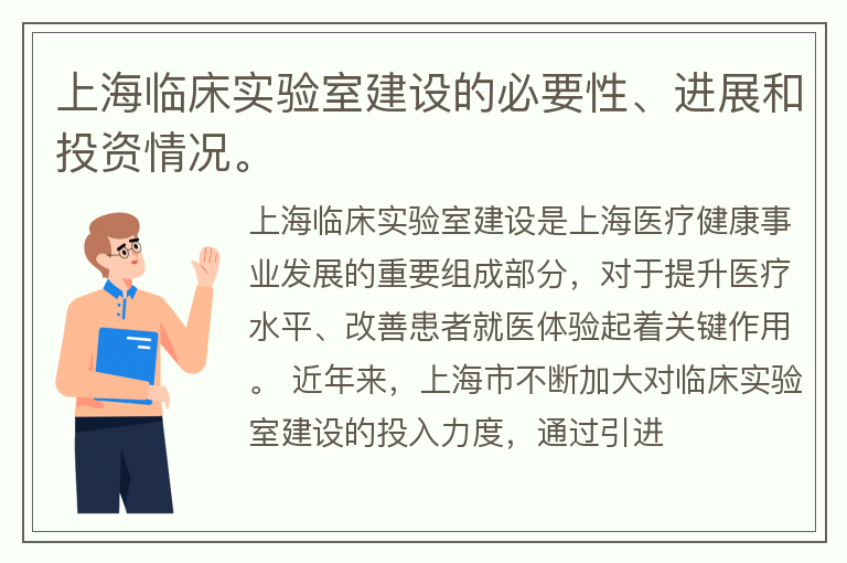 上海临床实验室建设是上海医疗健康事业发展的重要组成部分,对于提升医疗水平、改善患者就医体验起着关键作用。 近年来,上海市不断加大对临床实验室建设的投入力度,通过引进......【点击详情】