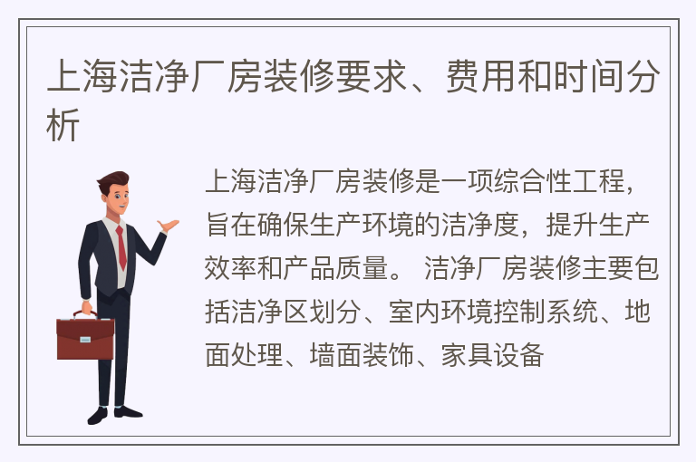 上海洁净厂房装修是一项综合性工程,旨在确保生产环境的洁净度,提升生产效率和产品质量。 洁净厂房装修主要包括洁净区划分、室内环境控制系统、地面处理、墙面装饰、家具设备......【点击详情】