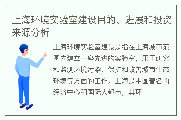 上海环境实验室建设是指在上海城市范围内建立一座先进的实验室,用于研究和监测环境污染、保护和改善城市生态环境等方面的工作。上海是中国著名的经济中心和国际大都市,其环......【点击详情】