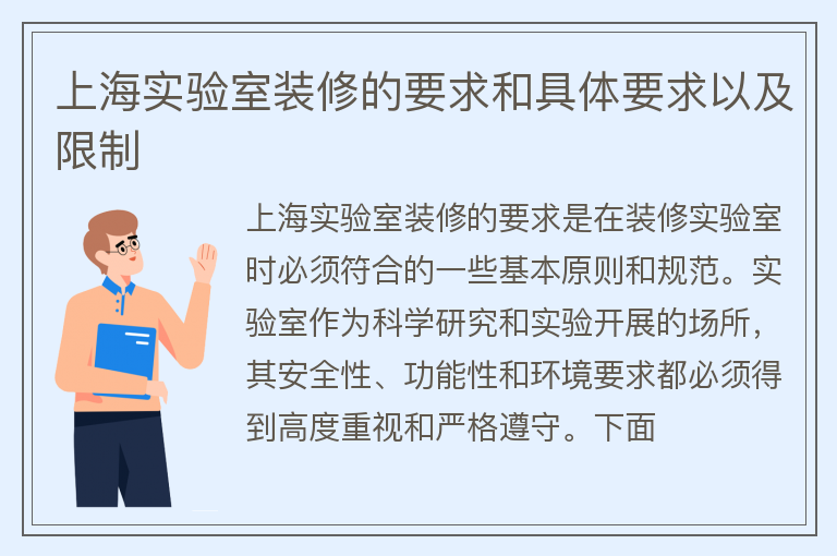 上海实验室装修的要求是在装修实验室时必须符合的一些基本原则和规范。实验室作为科学研究和实验开展的场所,其安全性、功能性和环境要求都必须得到高度重视和严格遵守。下面......【点击详情】