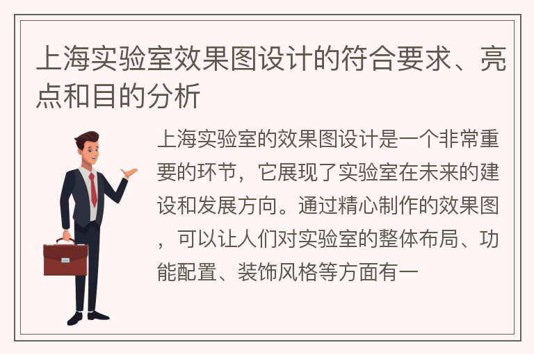 上海实验室的效果图设计是一个非常重要的环节,它展现了实验室在未来的建设和发展方向。通过精心制作的效果图,可以让人们对实验室的整体布局、功能配置、装饰风格等方面有一......【点击详情】