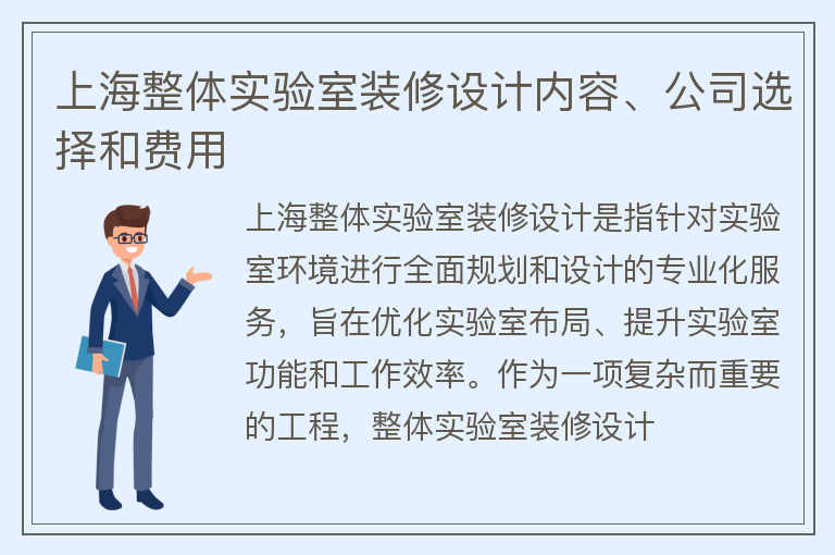 上海整体实验室装修设计是指针对实验室环境进行全面规划和设计的专业化服务,旨在优化实验室布局、提升实验室功能和工作效率。作为一项复杂而重要的工程,整体实验室装修设计......【点击详情】