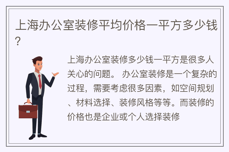 上海办公室装修多少钱一平方是很多人关心的问题。 办公室装修是一个复杂的过程,需要考虑很多因素,如空间规划、材料选择、装修风格等等。而装修的价格也是企业或个人选择装修......【点击详情】