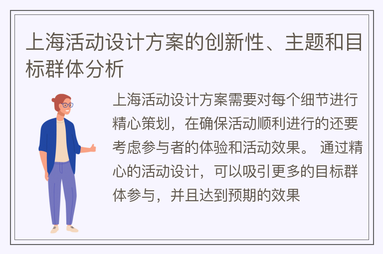 上海活动设计方案需要对每个细节进行精心策划,在确保活动顺利进行的还要考虑参与者的体验和活动效果。 通过精心的活动设计,可以吸引更多的目标群体参与,并且达到预期的效果......【点击详情】