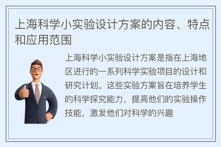上海科学小实验设计方案是指在上海地区进行的一系列科学实验项目的设计和研究计划。这些实验方案旨在培养学生的科学探究能力,提高他们的实验操作技能,激发他们对科学的兴趣......【点击详情】