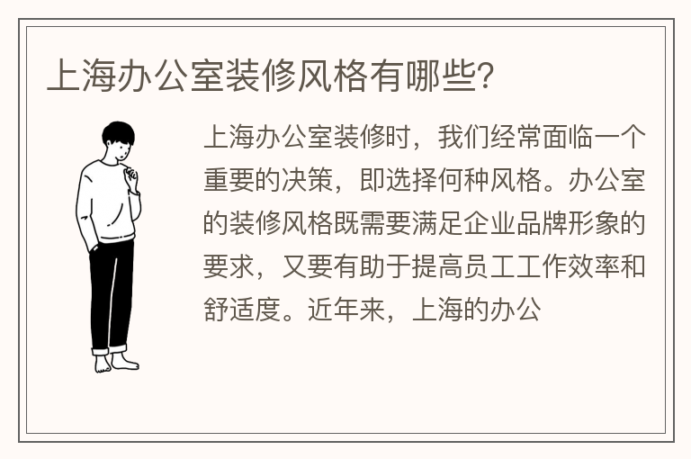 上海办公室装修时,我们经常面临一个重要的决策,即选择何种风格。办公室的装修风格既需要满足企业品牌形象的要求,又要有助于提高员工工作效率和舒适度。近年来,上海的办公......【点击详情】