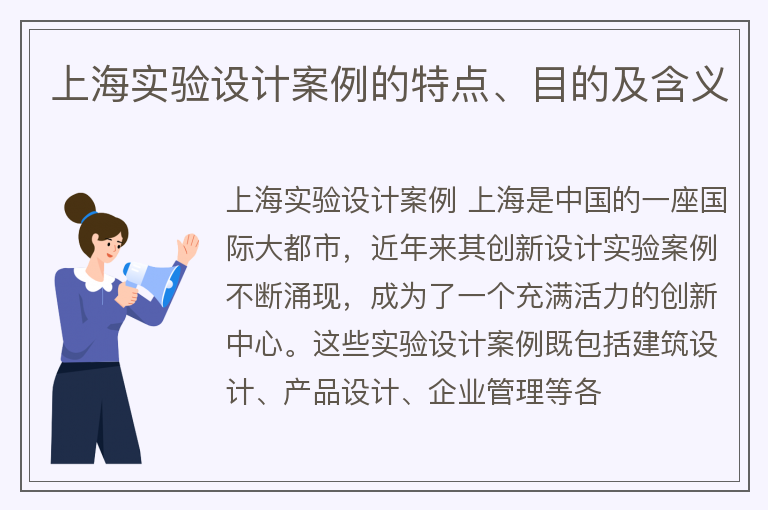 上海实验设计案例 上海是中国的一座国际大都市,近年来其创新设计实验案例不断涌现,成为了一个充满活力的创新中心。这些实验设计案例既包括建筑设计、产品设计、企业管理等各......【点击详情】