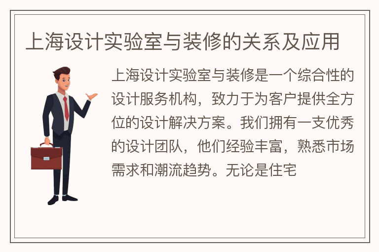 上海设计实验室与装修是一个综合性的设计服务机构,致力于为客户提供全方位的设计解决方案。我们拥有一支优秀的设计团队,他们经验丰富,熟悉市场需求和潮流趋势。无论是住宅......【点击详情】