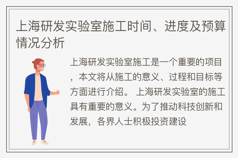 上海研发实验室施工是一个重要的项目,本文将从施工的意义、过程和目标等方面进行介绍。 上海研发实验室的施工具有重要的意义。为了推动科技创新和发展,各界人士积极投资建设......【点击详情】