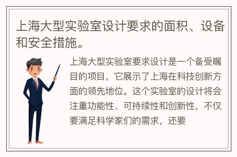 上海大型实验室要求设计是一个备受瞩目的项目,它展示了上海在科技创新方面的领先地位。这个实验室的设计将会注重功能性、可持续性和创新性,不仅要满足科学家们的需求,还要......【点击详情】