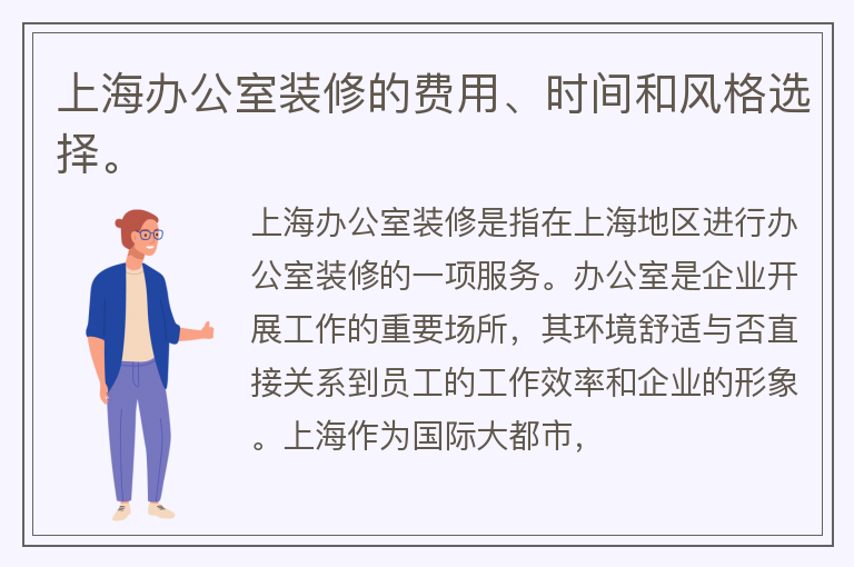 上海办公室装修是指在上海地区进行办公室装修的一项服务。办公室是企业开展工作的重要场所,其环境舒适与否直接关系到员工的工作效率和企业的形象。上海作为国际大都市,......【点击详情】