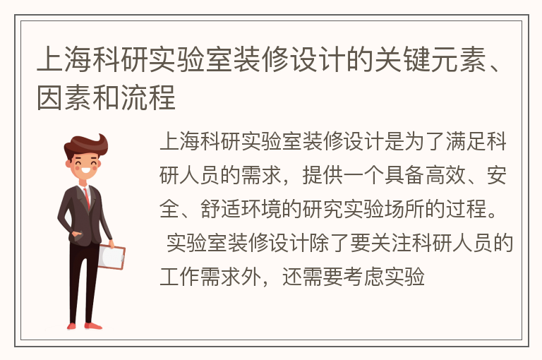 上海科研实验室装修设计是为了满足科研人员的需求,提供一个具备高效、安全、舒适环境的研究实验场所的过程。 实验室装修设计除了要关注科研人员的工作需求外,还需要考虑实验......【点击详情】