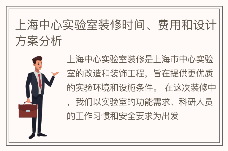 上海中心实验室装修是上海市中心实验室的改造和装饰工程,旨在提供更优质的实验环境和设施条件。 在这次装修中,我们以实验室的功能需求、科研人员的工作习惯和安全要求为出发......【点击详情】