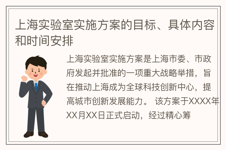 上海实验室实施方案是上海市委、市政府发起并批准的一项重大战略举措,旨在推动上海成为全球科技创新中心,提高城市创新发展能力。 该方案于XXXX年XX月XX日正式启动,经过精心筹......【点击详情】