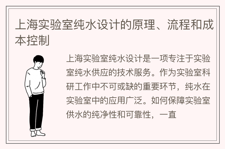 上海实验室纯水设计是一项专注于实验室纯水供应的技术服务。作为实验室科研工作中不可或缺的重要环节,纯水在实验室中的应用广泛。如何保障实验室供水的纯净性和可靠性,一直......【点击详情】