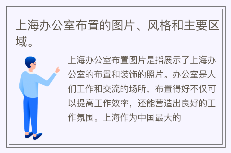 上海办公室布置图片是指展示了上海办公室的布置和装饰的照片。办公室是人们工作和交流的场所,布置得好不仅可以提高工作效率,还能营造出良好的工作氛围。上海作为中国最大的......【点击详情】