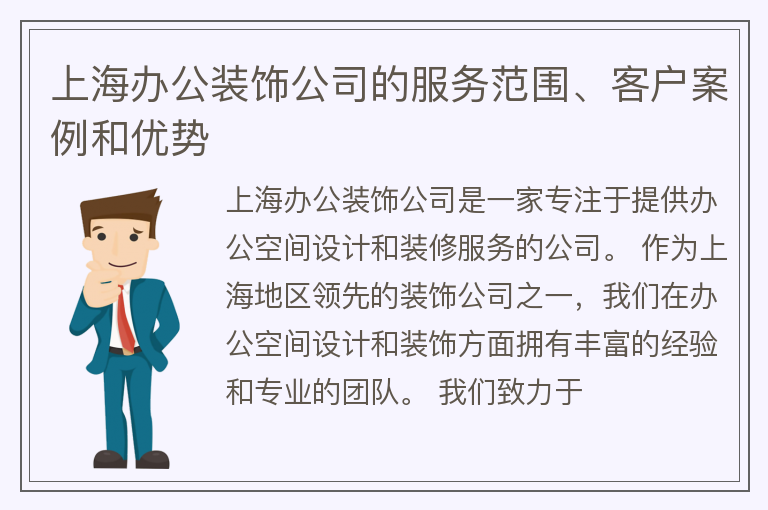 上海办公装饰公司是一家专注于提供办公空间设计和装修服务的公司。 作为上海地区领先的装饰公司之一,我们在办公空间设计和装饰方面拥有丰富的经验和专业的团队。 我们致力于......【点击详情】