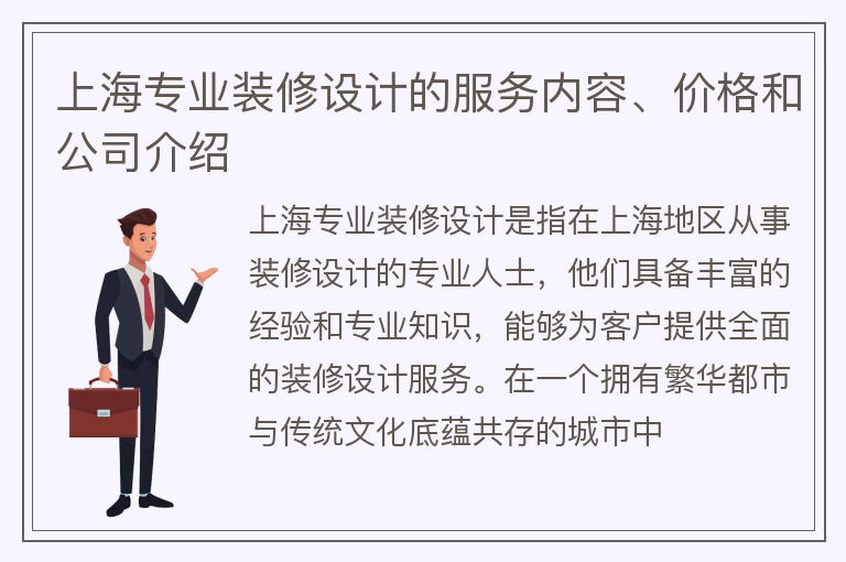上海专业装修设计是指在上海地区从事装修设计的专业人士,他们具备丰富的经验和专业知识,能够为客户提供全面的装修设计服务。在一个拥有繁华都市与传统文化底蕴共存的城市中......【点击详情】