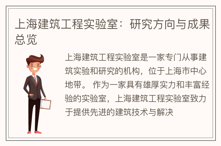 上海建筑工程实验室是一家专门从事建筑实验和研究的机构,位于上海市中心地带。 作为一家具有雄厚实力和丰富经验的实验室,上海建筑工程实验室致力于提供先进的建筑技术与解决......【点击详情】
