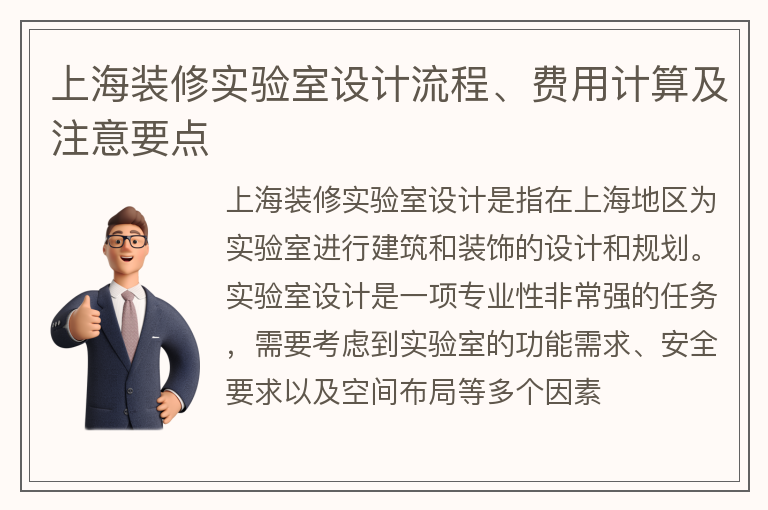 上海装修实验室设计是指在上海地区为实验室进行建筑和装饰的设计和规划。实验室设计是一项专业性非常强的任务,需要考虑到实验室的功能需求、安全要求以及空间布局等多个因素......【点击详情】