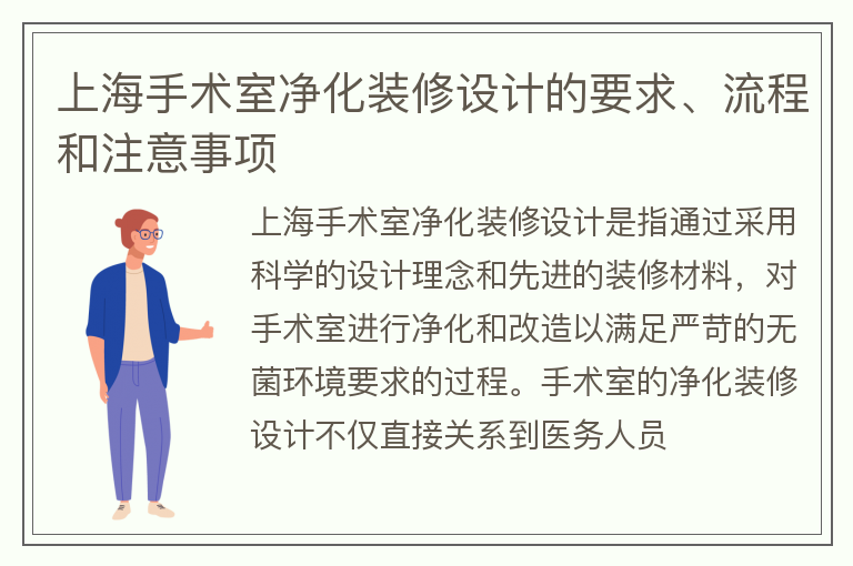 上海手术室净化装修设计是指通过采用科学的设计理念和先进的装修材料,对手术室进行净化和改造以满足严苛的无菌环境要求的过程。手术室的净化装修设计不仅直接关系到医务人员......【点击详情】