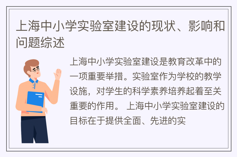 上海中小学实验室建设是教育改革中的一项重要举措。实验室作为学校的教学设施,对学生的科学素养培养起着至关重要的作用。 上海中小学实验室建设的目标在于提供全面、先进的实......【点击详情】