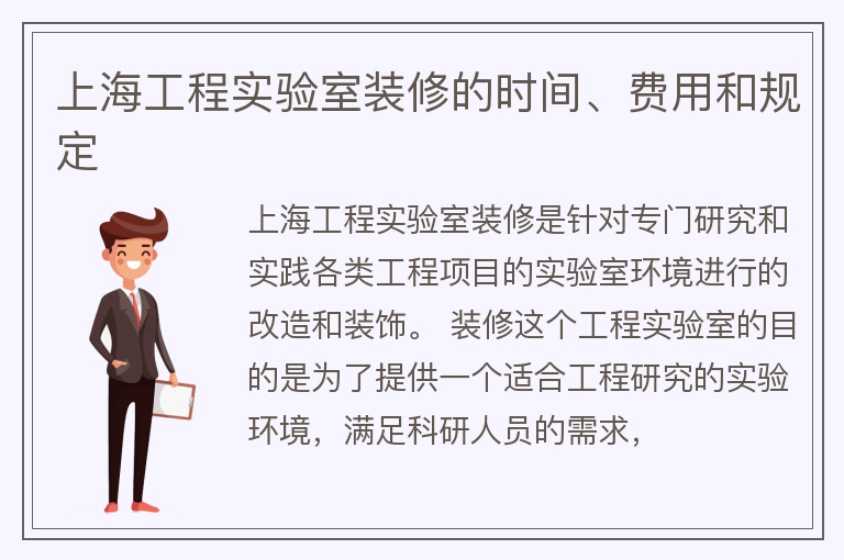 上海工程实验室装修是针对专门研究和实践各类工程项目的实验室环境进行的改造和装饰。 装修这个工程实验室的目的是为了提供一个适合工程研究的实验环境,满足科研人员的需求,......【点击详情】