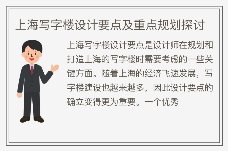 上海写字楼设计要点是设计师在规划和打造上海的写字楼时需要考虑的一些关键方面。随着上海的经济飞速发展,写字楼建设也越来越多,因此设计要点的确立变得更为重要。一个优秀......【点击详情】