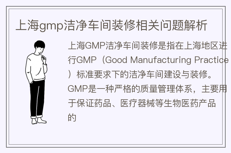 上海GMP洁净车间装修是指在上海地区进行GMP(Good Manufacturing Practice)标准要求下的洁净车间建设与装修。GMP是一种严格的质量管理体系,主要用于保证药品、医疗器械等生物医药产品的......【点击详情】