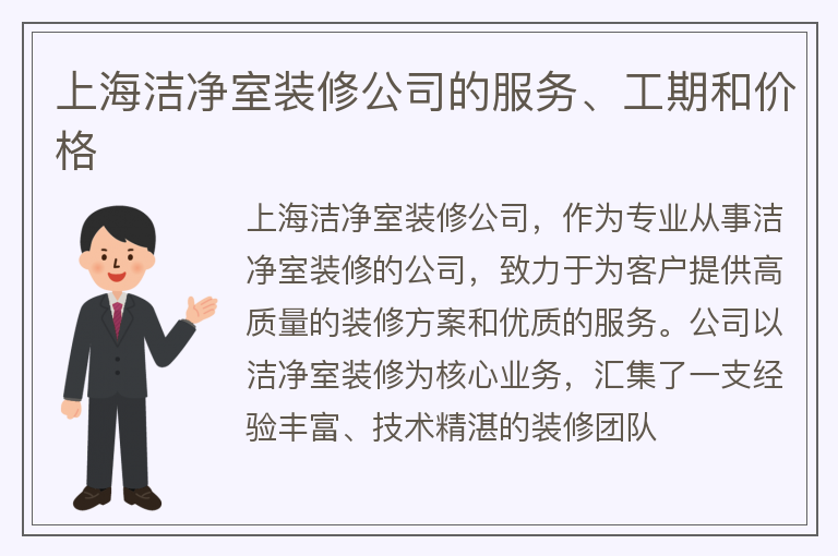 上海洁净室装修公司,作为专业从事洁净室装修的公司,致力于为客户提供高质量的装修方案和优质的服务。公司以洁净室装修为核心业务,汇集了一支经验丰富、技术精湛的装修团队......【点击详情】