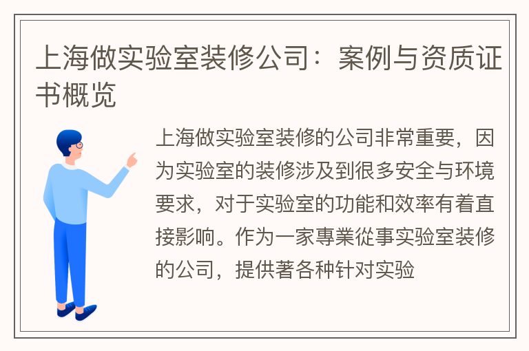 上海做实验室装修的公司非常重要,因为实验室的装修涉及到很多安全与环境要求,对于实验室的功能和效率有着直接影响。作为一家專業從事实验室装修的公司,提供著各种针对实验......【点击详情】