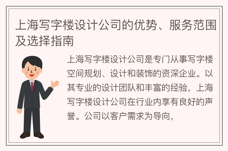 上海写字楼设计公司是专门从事写字楼空间规划、设计和装饰的资深企业。以其专业的设计团队和丰富的经验,上海写字楼设计公司在行业内享有良好的声誉。公司以客户需求为导向,......【点击详情】