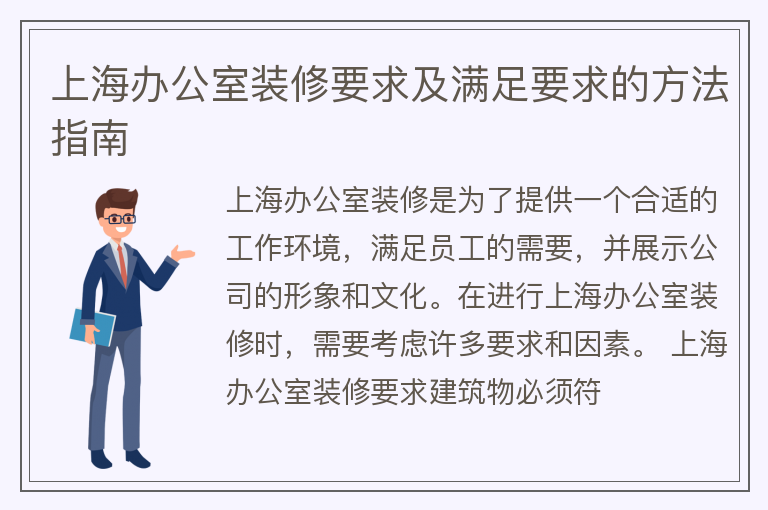 上海办公室装修是为了提供一个合适的工作环境,满足员工的需要,并展示公司的形象和文化。在进行上海办公室装修时,需要考虑许多要求和因素。 上海办公室装修要求建筑物必须符......【点击详情】